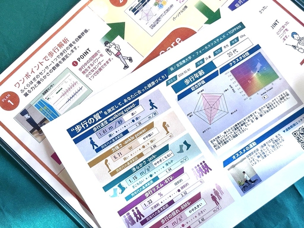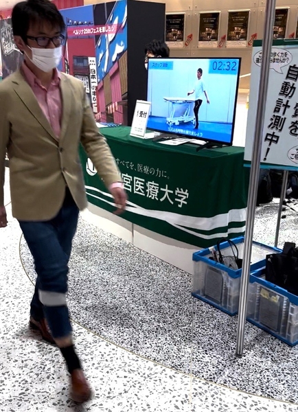 今回展示される研究は、TOPPAN株式会社と株式会社フォーカスシステムズ、TRY and TRIとの共同研究で、高齢者の歩行能力を推定する際に重要な指標となる、歩行中の足関節で発生するパワーを小さなセンサー1つで計測するシステムを開発し、社会実装に向けて取組んでいます。具体的には、利用者がふくらはぎに小さなセンサーを着けた状態で、数メートル歩行するところをスマートフォン等のアプリを使用して撮影することで、「歩行中に床を蹴る力」と「運動の滑らかさ」を自動評価できます。さらに、その結果に基づいたリハビリトレーニングを自動で指導するシステムも兼ね備えています。システムが実用化された際には、簡易に歩行能力が計測でき、それに伴うリハビリトレーニングを自動で指導することで、より多くの方の移動能力低下を防ぐことが期待されます。
