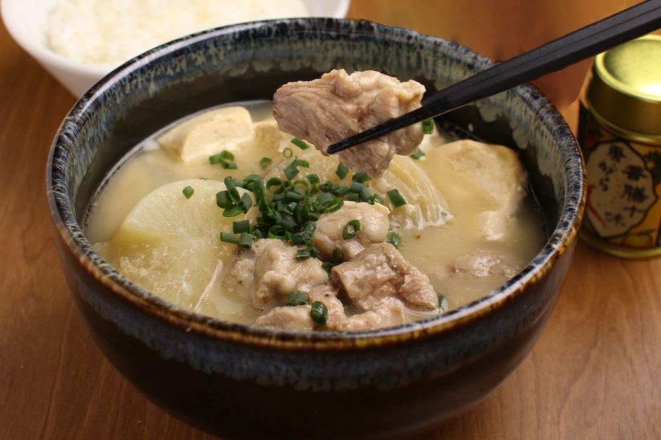 豚骨ベースのスープに白味噌で仕立てた特製の豚汁。柔らかくごろっとした豚肉の旨味が溶け出し、たっぷり入った野菜や豆腐に染み込み、これだけでもご飯が進む。他の定食メニューの味噌汁から+400円で変更も可能。