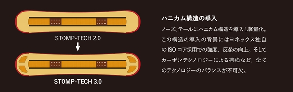 ヨネックス史上最軽量のスウィングウェイトを実現した独自の新構造「STOMP-TECH3.0」を採用。重心をセンターに置き、ノーズとテールはハニカム構造を採用する等、ボード全体を軽量化。スウィングウェイトを軽くすることで、エアでの高回転スピンと安定したパフォーマンスを生み出します。