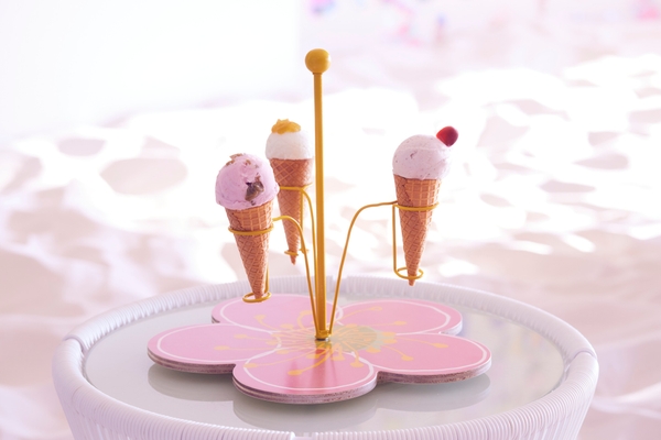梅の果肉やジャム、ねりうめを使用した3種類のジェラートを味わえるプレートです。ジェラートの食べ比べを通して、それぞれの風味や食感の違いを楽しむことができます。プレートの土台は梅の花、スタンド部分はめしべをモチーフとした可愛らしい見た目に思わずわくわくします。
