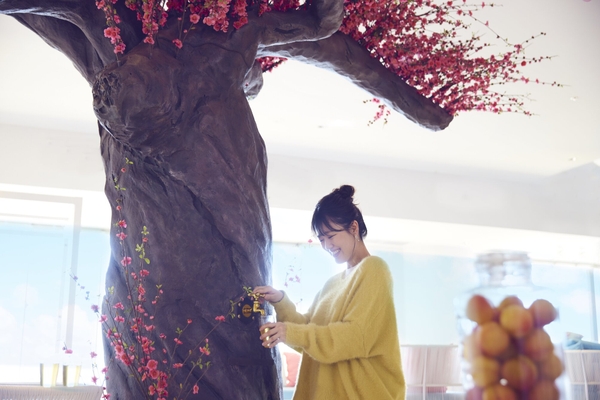 カフェの入口には、熱海梅園で多く咲く品種「八重寒紅(やえかんこう)」の色味になぞらえた、梅の木の装飾が設えられます。見上げると、まるで満開に咲き誇る梅に包まれているかのような気分を味わえます。幹に付いている蛇口から出てくるのは梅ジュースです。梅のさっぱりとした風味を味わいながら、春の訪れを感じられます。