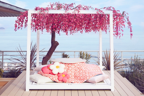 梅の花の形や色味を活かしたテーブルやいす、ガーランドなどが設えられた空間で、思い思いのひとときを過ごせます。梅型のこたつと梅の花の装飾が設えられたテラスでは、眼下に広がる海の青色と紅梅色のコントラストを楽しむことが可能です。春告げ草である梅に囲まれ、ドリンクを飲んだり読書をしたりしながら、一足早い春の訪れを存分に感じることができます。