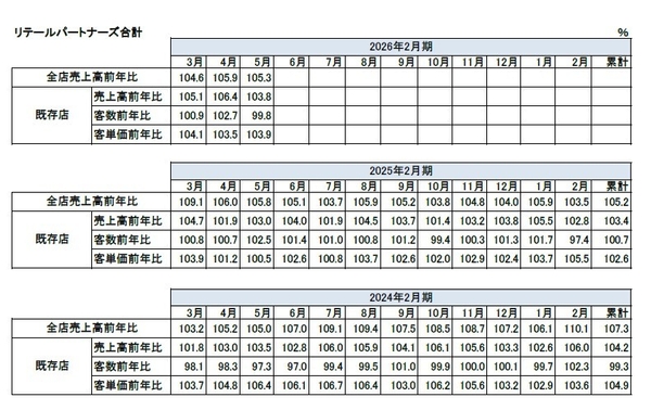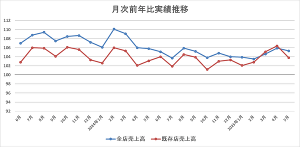株式会社リテールパートナーズ(本社:山口県/代表取締役社長:田中康男)の2025年5月の全店売上高前年比は105.3%であった。