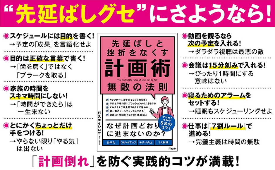 『先延ばしと挫折をなくす計画術 無敵の法則』は、発売早々に4刷となった『心をつかむ話し方 無敵の法則』に続く、野呂エイシロウさんの「無敵の法則」シリーズ第2弾。