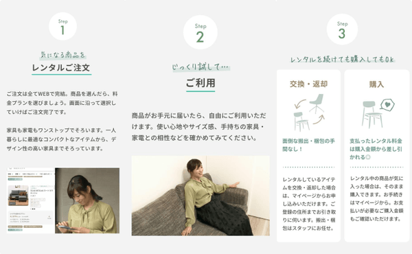 CLASは、お客様に本当に満足いただける“暮らし”の実現を目指し、「レンタル中のアイテムが気に入った」「購入前に試したい」「初期費用を抑えたい」といったニーズに応える「あとから購入」を提供することで、以下の点で高い評価をいただいております。