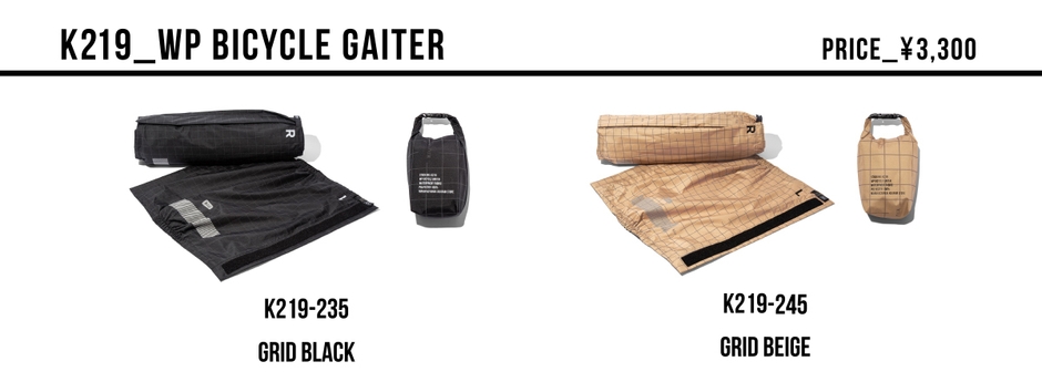 雨の日のボトムスの濡れを防ぐバイシクルゲイター。山用のゲイターを普段でも使いやすい仕様にアレンジしました。長めの丈で広範囲をカバーすることができ、上部と下部に設けたアジャスターと滑り止めがフィット感を高めます。収納袋付きで持ち運びにも便利です。