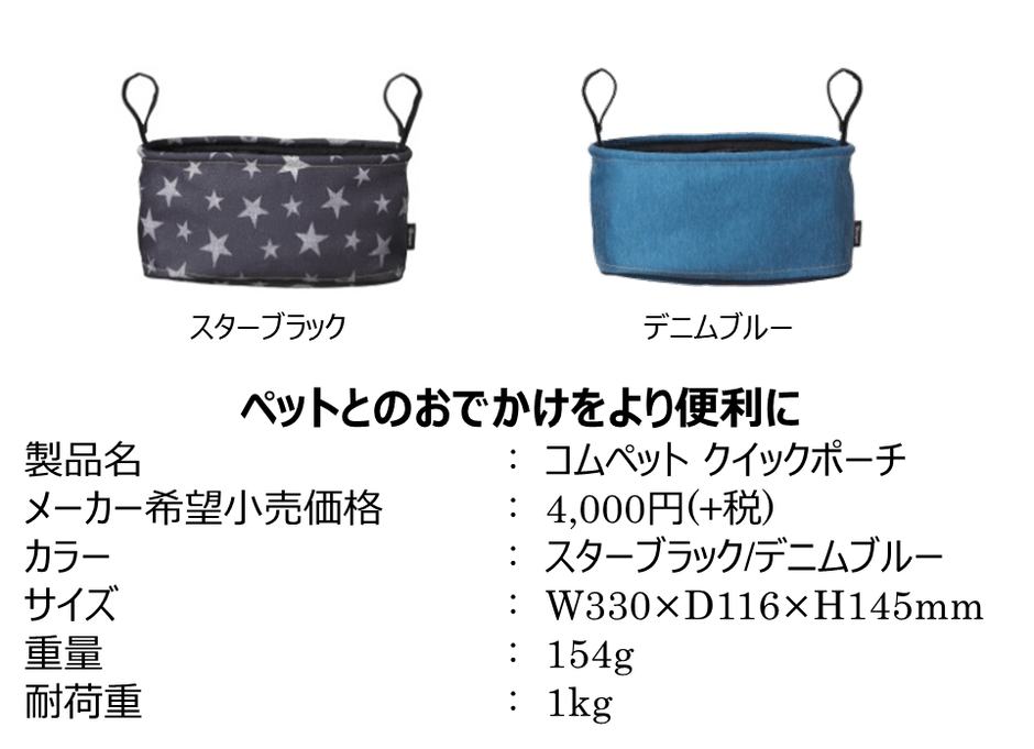 ベビー用品・乳幼児玩具などの開発・製造・販売を行うコンビ株式会社は、ペットのためのブランド「コムペット(compet)」から、ペットカートにつければ、使いたい物がサッと取り出せる「コムペット クイックポーチ」を2019年9月下旬に発売いたします。