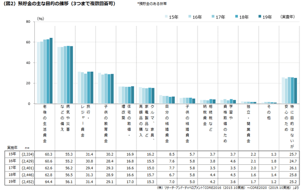 ●預貯金の目的は「老後の生活資金」とする人が最も多く、4年間微増を継続。(図2)