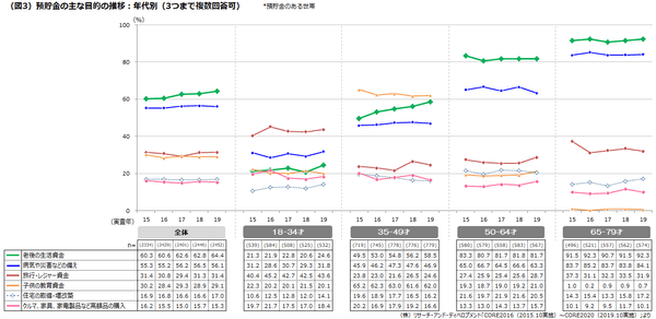 預貯金の目的で「老後の生活資金」の割合が高いのは65~79歳(92.3%)と50~64歳(81.7%)ですが、ここ数年は横ばいです。しかし、35~49歳では2015年の49.5%から、今年は58.5%と4年間で9ポイント増加しています。一方、「旅行・レジャー資金」「クルマ、家具、家電製品など高額品の購入」は減少傾向にあり、いずれも18年から19年にかけて微減しています。また、18~34歳の若い世代でも「老後の生活資金」が4ポイント増えています。