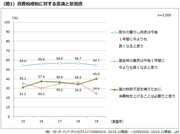消費税増税直後の2019年10月の調査では、「国の財政不足を補うために、消費税を上げることは必要だと思う」は、前の年より5.7ポイント増加して40.0%となっています。一方、「国全体の景気は今後1年間に今よりも良くなると思う」は11.9ポイント減少し、最近5年間で最も低くなっています。また、ここ数年微増を続けていた「自分の暮らし向きは今後1年間に今よりも良くなると思う」は微減に転じています。