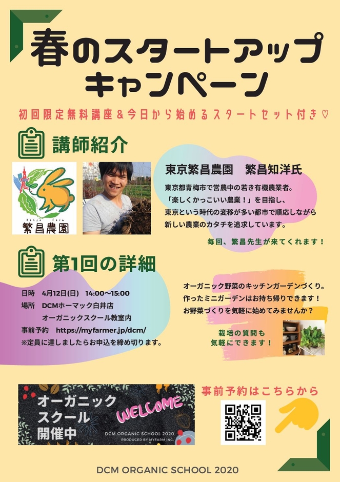 株式会社マイファーム(京都府京都市、代表取締役 西辻 一真、以下マイファーム)が運営を担当する「DCMオーガニックスクール」は、今年で3年目を迎え、さらにパワーアップして4月よりスタートします。有機農業の知識習得やすぐに始められる野菜作りのアドバイス、2020年度はオーガニックイベントの開催など盛りだくさんでお届けします。