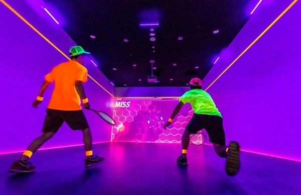 通常のスカッシュと同様に四方を壁に囲まれた空間で、正面の壁にプロジェクターで投影されたコンテンツに対して、ボールをたくさんぶつけたり、的を狙いながらラリーを継続する等のシンプルなルールのもと、仲間と一緒に目標達成を目指しながらプレイします。