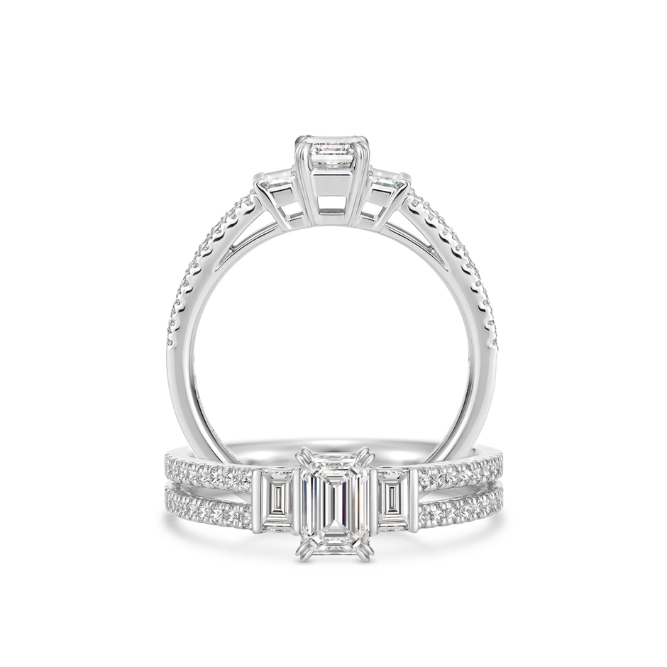 凛とした佇まいが美しい、エメラルドカットのダイヤモンドが主役。両隣にはバケットカットダイヤモンドきらめきます。