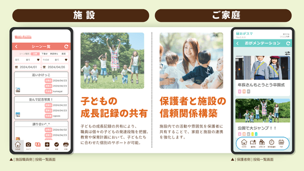 共有された成長記録は施設職員の他、ご家庭でも保護者向けアプリから閲覧することができます。