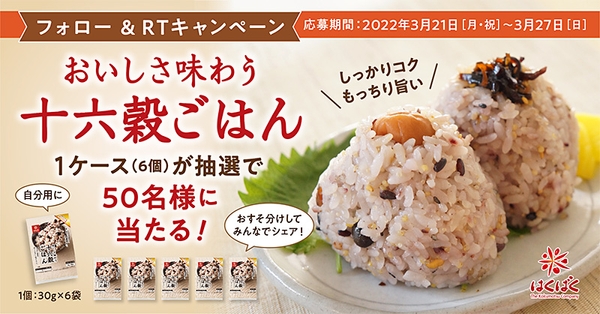 穀物のリーディングカンパニー株式会社はくばく(本社:山梨県中央市、代表取締役社長:長澤 重俊)は公式Twitterアカウント「@hakubaku_jp」で「『おいしさ味わう十六穀ごはん1ケース((30g×6袋)×6個入) 』が抽選で 50 名様に当たる フォロー &RT キャンペーン」を3/21(月)から実施します。
