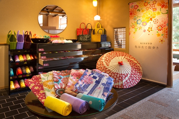豊富な色浴衣や柄帯、髪飾り、湯籠、足袋、花草履、番傘、道行灯などお好みのスタイルで鶴仙渓やゆげ街道の散策にお出かけください。