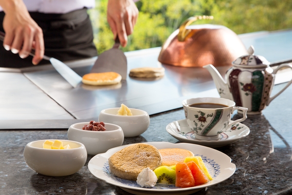 シェフが目の前で焼き上げる日替わりのご当地パンケーキとティーをご到着後のひとときにお愉しみいただけます。