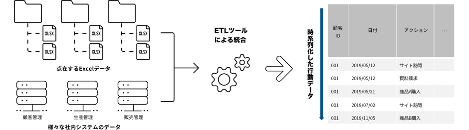 プロジェクトの最初にさまざまな形式のデータをまとめて読み込み、ETLツールにて「カスタマージャーニー型データ」に変換します。この処理を行う上で、データの構造上の問題を洗い出し、適切な補正処理も行っていきます。