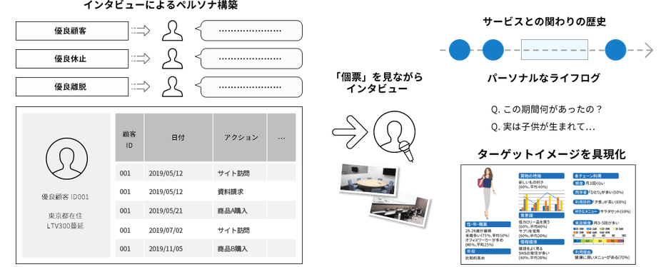 行動データのみでは、データの存在しない休眠期間に何があったか分からないという限界があります。フラグ化した顧客の心理面での違いをアスキングによって捉え、顧客を具体化していきます。“個票”に紐づけて生の声を聴取することで、課題が明らかになります。