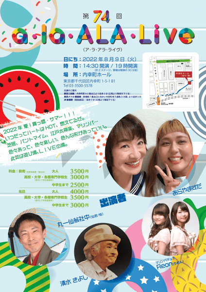 a・la・ALA・Live主催、第74回「a・la・ALA・Live」(ア・ラ・アラ・ライヴ) が2022年8月9日(火)に内幸町ホール(東京都千代田区)にて開催されます。チケットはカンフェティ(運営:ロングランプランニング株式会社、東京都新宿区、代表取締役:榑松 大剛)にて発売中です。