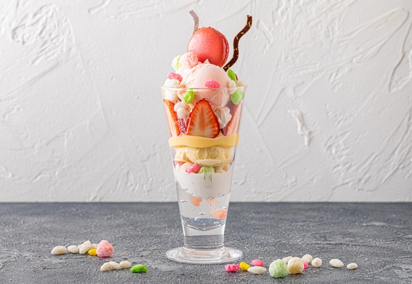(チョコレート、マカロン、アイスクリーム3種、生クリーム、苺、ひなあられ、桜ゆりね、エディブルフラワー・ペンタス、カスタードクリーム、水ゼリー、コーンフレーク等)