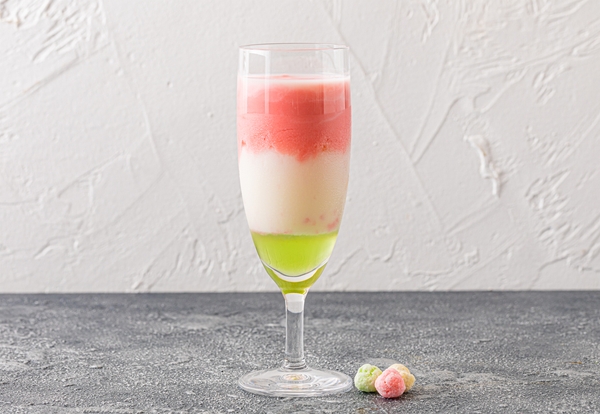 菱餅の3色を表現したヨーグルト風味のモクテル(ノンアルコールカクテル)を、女性に嬉しいローファット仕様で提供いたします。よく混ぜると3層のカラーが混ざって淡い桜色がより一層広がり、春気分を盛り上げます。