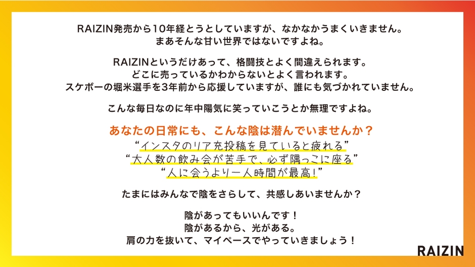 公式Twitterアカウント「RAIZIN(@ RAIZIN_taisho)」より配信される「私のここ陰キャだなと思うところ」をリプライしてください。その中から抽選で10名様にRAIZIN30本+RAIZINアンバサダーマフラータオルをプレゼントします。