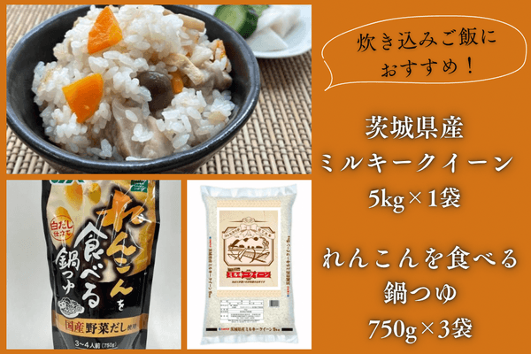 JA全農が運営する産地直送通販サイト「JAタウン」のショップ「いいものいっぱい広場」は、茨城県産米「ミルキークイーン」と「れんこんを食べる鍋つゆ」セットを販売しています。