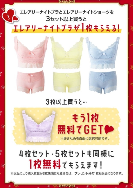 株式会社イッティ(所在地:東京都渋谷区渋谷2-14-18、代表取締役;瀧本洋、URL https://www.itty.co.jp/)は、一年に一度の「クリスマス」にかわいさを追求したエレアリーナイトブラ&ショーツを着てクリスマス気分を盛り上げていただきたいと考えました。そこで小さいバストや離れたバストなどのお悩みをサポートする、エレアリーナイトブラとショーツのセットを3枚以上ご購入の方には、期間限定でさらにナイトブラを1枚プレゼントいたします。