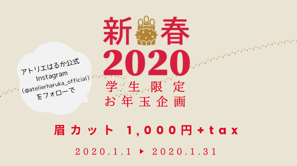 全国64店舗でヘアメイク&ネイルサービスを提供する「アトリエはるか」(株式会社アトリエはるか、所在地:愛知県名古屋市、代表取締役社長:岩井 良子)は、学生限定の2020年新春お年玉企画を2020年1月1日(水)~1月31日(金)まで期間限定でスタートしています。