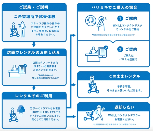 WHILLレンタルから購入に切り替えることも可能です。パリミキでご購入される場合、まずはWHILLコンタクトデスク(0800-080-4338 ※通話無料 平日9:00〜18:00)にてご解約後、パリミキ店頭でご購入手続きを行ってください。