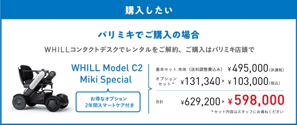 特典として、予備のアームカバーや2年間(5回)の点検・サポートサービス、便利なアクセサリー類がセットとなっている、パリミキだけのお得なプラン「WHILL Model C2 Miki Special」をお申し込みいただけます。