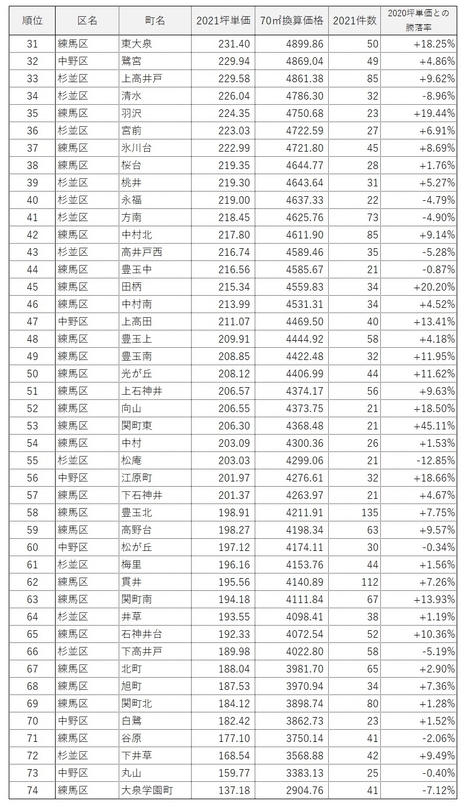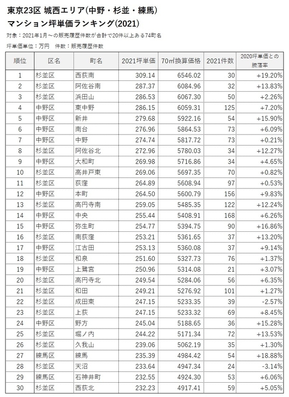 ・1位は「杉並区西荻南」の309万1,400円。以下、「杉並区阿佐谷南」「杉並区浜田山」「中野区東中野」までは70㎡換算価格が6,000万円台となった。