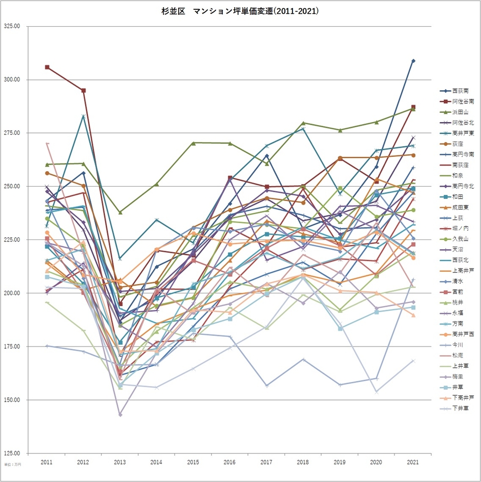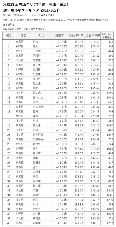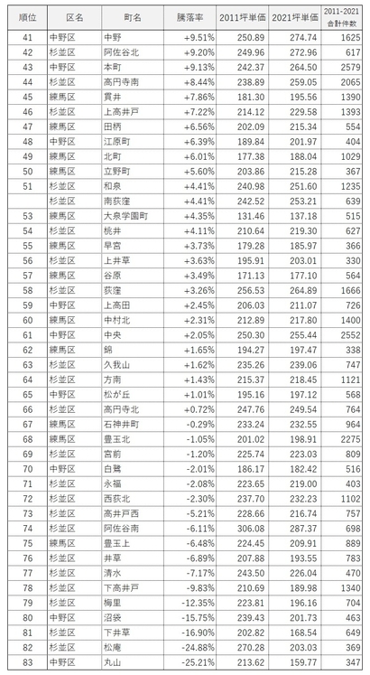 2011年と2021年のマンション坪単価より騰落率を算出。