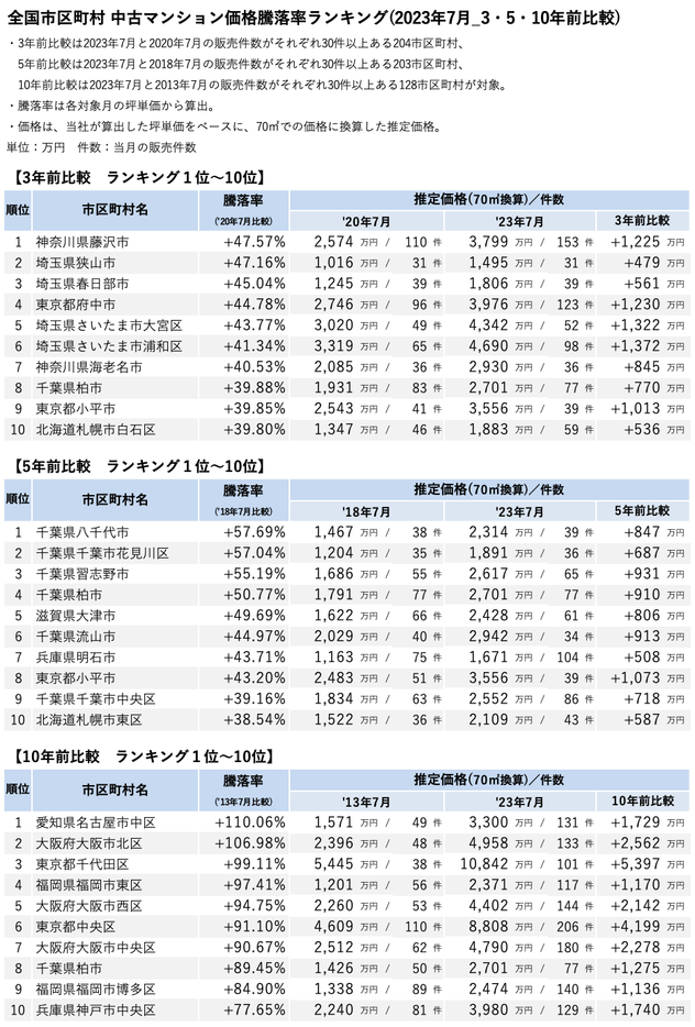 「マンションレビュー」2023年7月 全国市区町村 中古マンション価格/騰落率ランキング100を発表