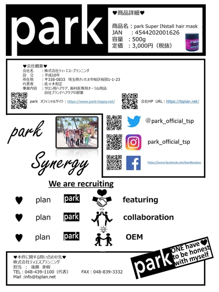 株式会社ティエスプランニングは、ヘアメイクやスタイリスト、 メイクアップグッズの製品開発アドバイザーや、各企業における 商品のトータルプロデューサーなど多彩な才能を持つhynataと オリジナルブランド【park】を立ち上げ、その第一弾のヘアマスクの 先行発売を開始致しました。