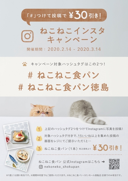 ご自身のインスタグラムに下記の2つのハッシュタグを付けて「ねこねこ食パン」を投稿していただき、「♥15いいね」をゲットすると、ねこねこ食パン1斤が30円引き!