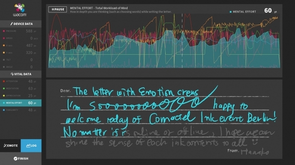 株式会社ワコム(本社:埼玉県加須市、代表:山田正彦、以下 ワコム)と株式会社ワン・トゥー・テン・ドライブ(本社:京都市、東京オフィス:品川区、代表: 梅田亮、以下 1→10drive)は、タブレット端末やパソコンなど、モバイルIT機器で手書き入力した文章に、筆者の感情データ(集中、リラックス、負荷、理解・習熟、興味など)を埋め込んで記録し、文章を再生する時に同時表示できる『感情を伝える手紙』のプロトタイプを開発しました。