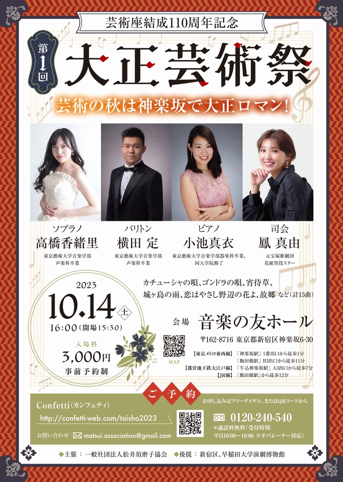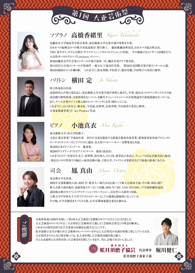 芸術座結成110周年という記念すべき年に、大正芸術祭を開催させていただくことになりました。大正芸術祭の理念は、「大正時代に芸術座が主催した『芸術座音楽会』の理念を継承し、若手音楽家を応援すること」です。松井須磨子が歌った『カチューシャの唄』や『ゴンドラの唄』は勿論のこと、芸術座のレパートリーを中心に大正時代の名曲を皆様に楽しんでいただきます。そして、大正時代からどんなに時が経っても、先人達が残した芸術的功績を称え敬う、そんな永続性と公共性を持った芸術祭を目指して参ります。