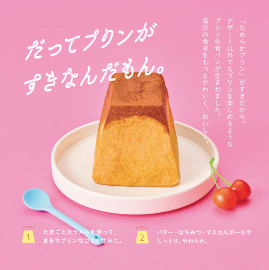 こだわりとおいしさの秘密はパステルの「なめらかプリン」のイメージから。「なめらかプリン」のような、しっとり、やわらかな食パンです。たまご、バター、はちみつ、マスカルポーネを配合したリッチな食パン生地と、上部にはカラメル風味のマドレーヌ生地、この2種類の生地の組み合わせで独特な食感を実現し、コロンとかわいい食べきりサイズのプリンの形に仕上げました。