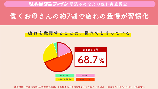さらに働くお母さんに対して、「疲れをガマンすることに慣れてしまっている」という質問に対してあてはまると回答される方が68.7%にものぼり(「あてはまる」、「ややあてはまる」と答えた方の合計)、「疲れた“ママ”」の状態が常態化していることが推察されます。