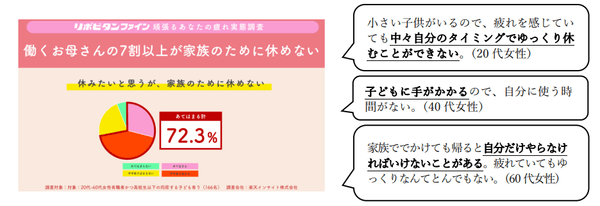その他、「疲れを感じることがあるが、特に対処をしていない理由」をフリーアンサーで伺ったところ、仕事を抱えつつも、自宅では母として家族のためにがんばってしまう、そんな休む間が無い働くお母さんの実態が垣間見えました。