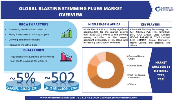 世界のブラストステミングプラグ市場は、おおよその収益額を2021年には5億200万米ドルで、予測期間、すなわち2022年から2031年にかけて約5%のCAGRで成長すると推定されています。材料の種類に基づいて、市場は砕石チップ、粗い砂、高速硬化コンクリートなどにセグメント化されています。これらのうち、砕石チップセグメントは、予測期間中に大幅なCAGRで成長することにより、価値において最大の市場シェアを保持すると予想されています。このセグメントの成長は、ステミング材料に対する需要の高まり、建設契約の増加、鉱業の普及率の高まりと関連している可能性があります。