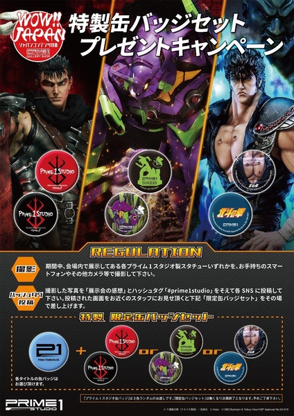 期間中、展示してあるプライム1スタジオ製スタチューをお手持ちのスマートフォンなどで撮影し、展示の感想とハッシュタグ「#prime1studio」を添えて各SNSに投稿して下さい。その画面をお近くのスタッフにお見せいただくと、限定缶バッジがその場でもらえるキャンペーンを実施中です。