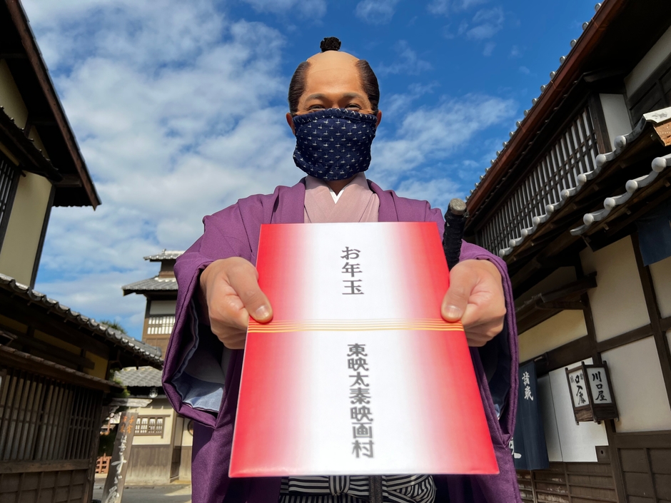 先着1日2 0 0 名様(子供限定) に時代劇の格好をした東映の俳優からお年玉ポチ袋プレゼント。