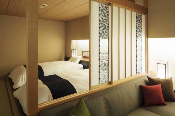 界 日光のご当地部屋は、日光の歴史の中で培われた繊細な鹿沼組子の美しさに触れることができる客室です。障子、ベッドボード、ベッドサイドランプに施された伝統工芸に心奪われます。自分で組み立てることができる「組子コースター」のセットも添えられています。