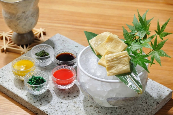 界では、温泉旅館でしか飲めない「至福の湯上がりビール」を開発し、同ブランドの全国15施設で一斉提供しています。界 日光では、このビールを、夏の生き生きとした緑が映える男体山を眼前に望む「山望テラス」で提供します。ビールには、日光名物「生湯波」をおつまみとして添えて提供します。東照宮の建造に使われる七色になぞらえ、色彩豊かなタレと薬味を添えます。