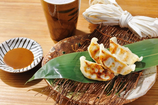界全施設で提供中の「至福の湯上がりビール」の取り組みにおいて界 川治では、このビールを里山の万緑に面した客室にある「ごろんとソファー」で提供します。ソファーに深く身をあずけてビールを飲めば一気に脱力でき、お部屋で湯涼み時間を楽しめます。ビールには、かんぴょうが具材として入った餃子をお出しします。味噌だれをつけて食べます。