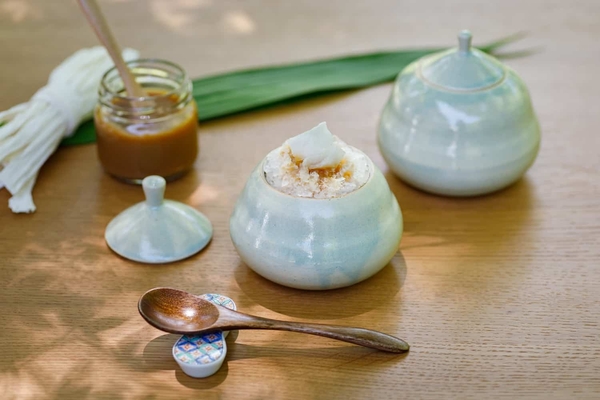界 川治では、夕顔の形を模した器にふわふわの氷とかんぴょうのシロップ煮が盛り付けられた愛らしいかき氷を提供します。栃木県那須高原のジャージー牛を使った星野リゾートのオリジナルミルクジャムが、とろりとひとさじかけられていて、やさしい甘さに癒される一品です。