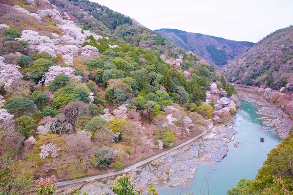 奥嵐山の花見舟では、日本さくら名所100選に選定された嵐山*3の景色をひとり占め気分で鑑賞できます。両岸に位置する小倉山と嵐山は斜面が急なので、ソメイヨシノやヤマザクラなど約1500本の桜の一本一本が際立ち、山肌を桜色に染めます。翡翠の屋根にはガラスがはめ込まれているため、頭上に広がる青空と桜を同時に眺められるのも、このアクティビティならではです。また、翡翠は手漕ぎで静かに川面を進むため、水鏡のように川面に反射する桜も間近に見ることができるなど、地上から見る桜とは違った趣を楽しむこともできます。